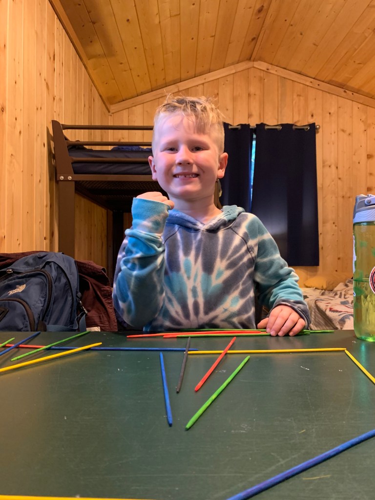During our adventures though, he realized there were other kids! This meant that the entire rest of the trip was him negotiating more trips around the campground to see if the kids would take the bait and play with him. It was really sad, and sort of exhausting. Scott and I played with him a lot. He was thrilled with the campground scavenger hunts I brought, but he finished those in 20 minutes. We fell back on the growing sea creatures, he colored a little, we played cards a little (but only after strict conversations that we would no longer play if he kept cheating – he honored that agreement finally), and let him ride around our safe little cabin loop on his bike – he only went out of sight when he was behind the shower room, but would reappear with shouts of “Watch me! Watch me!” Which I did all the next morning, standing by the tree he told me to stand by, and clapping every single time he whooshed by.