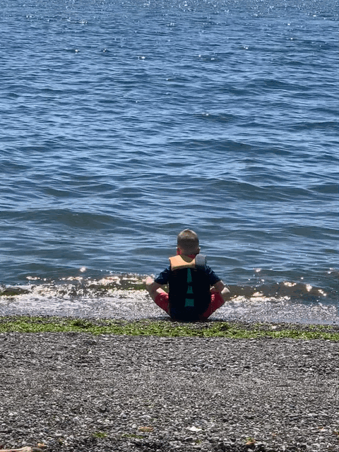 The beach was wild, and lovely, rocky and grassy. It was also deserted and lonely. There was a busy boat launch and one other family quite a ways down the beach. We flew a kite. Negotiated the hell out of wearing the life jacket if he was going to wade in the water – even calling his mom to back us up. He asked me to take him down to play with the kids in the other family. I agreed, but as we got closer I could see it was tiny little girl and a baby. I mean like under two years old. I stopped…
