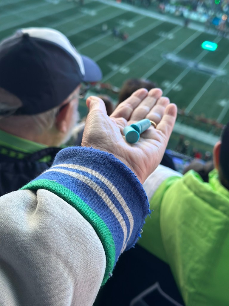In 1997 my dad married a woman he met through his cousin. His friends teased him, insisting that he only married her because she had Seahawks season tickets – which was only partly true. Just kidding. I didn’t realize until maybe twenty years later, after the tickets were passed down to Scott and me, that they were not just any tickets. They were charter tickets. Tickets purchased the inaugural year of the Seahawks – their very first season. She and her husband held onto them for years, and when her husband, Ray, passed away she continued to hold onto them. And when she married my dad, they went to games together.
